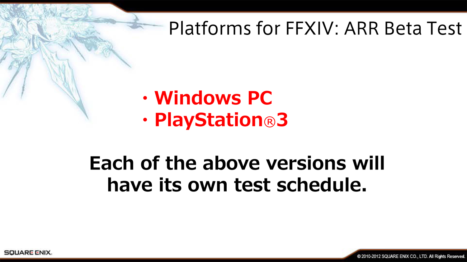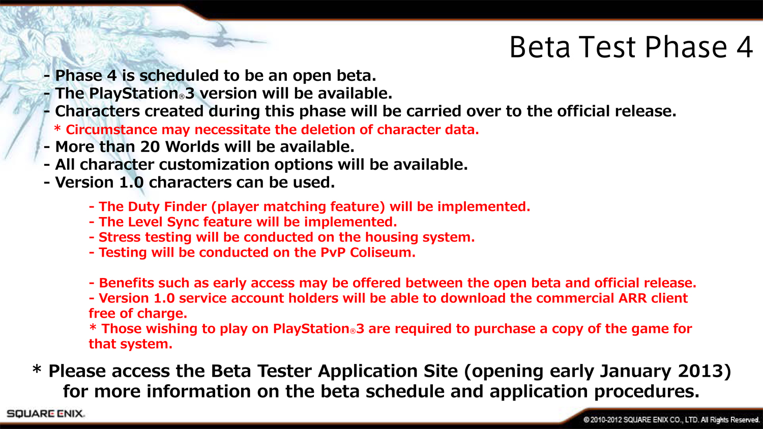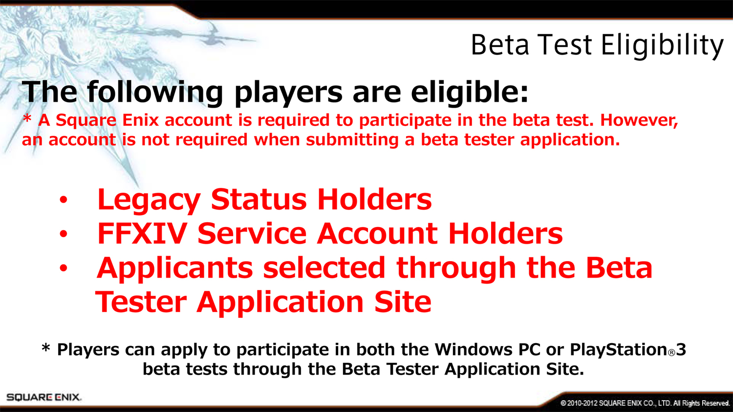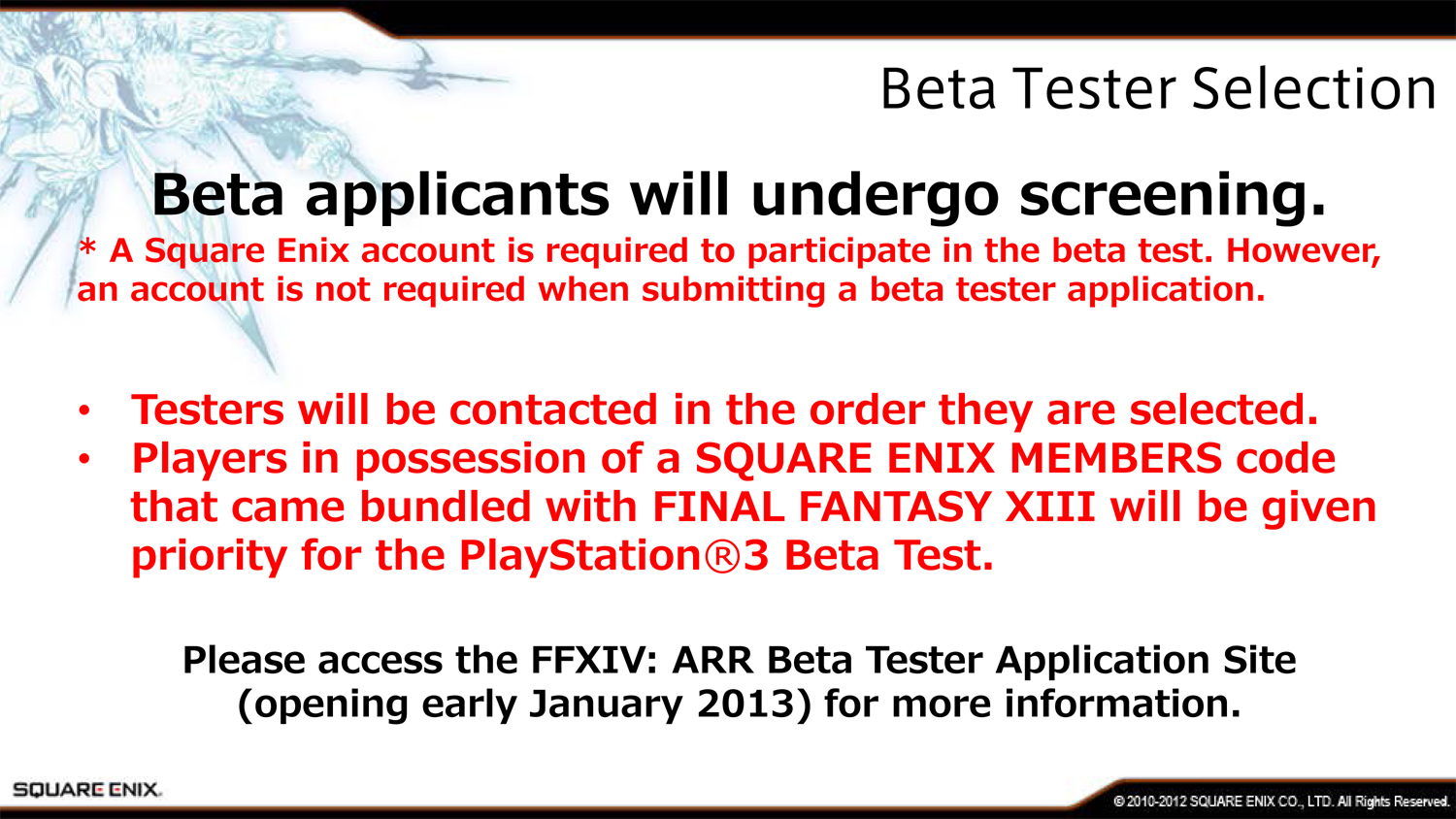 Владельцы PlayStation 3 смогут принять участие в бета-тесте Final Fantasy XIV: A Realm Reborn начиная с третьей фазы. Для этого им нужно будет активировать код членства в клубе Square Enix, который шел в комплекте с Final Fantasy XIII. Такой код идет практически со всеми играми компании, но издатель упоминает именно тринадцатую часть “Финалки”.