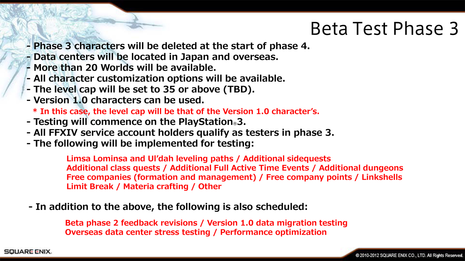 Третья фаза позволит игрокам опробовать абсолютно все опции кастомизации персонажа, прокачаться до 35 уровня и пробежаться по 20 мирам. Используемые сервера будут находиться в Японии, поэтому некоторых игроков может ждать нестабильное соединение с ними.