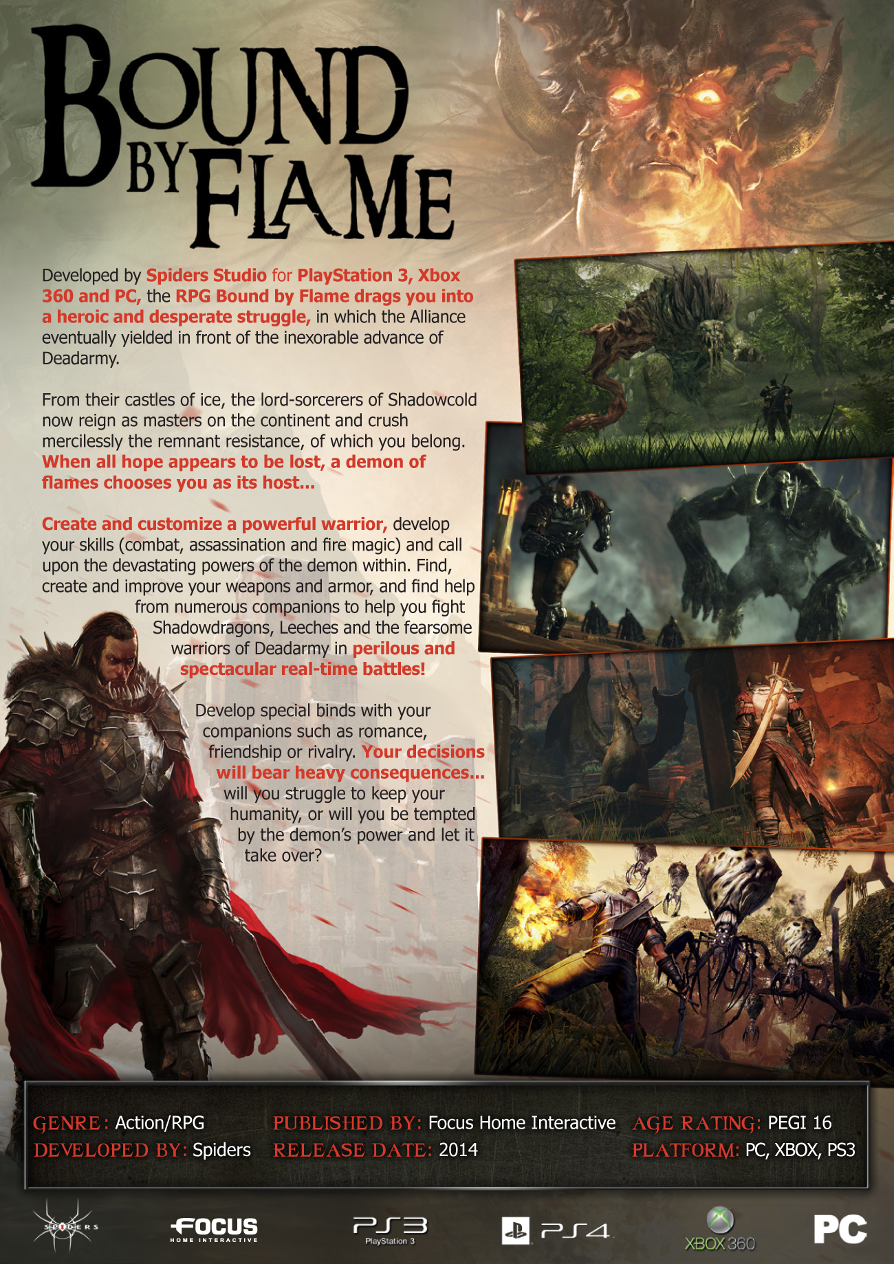 Bound by Flame – новая ролевая игра от Spiders studios, создателей недавно вышедшей Mars: War Logs, вчера вечером была официально подтверждена для выхода на PlayStation 4. Впервые игра предстала перед зрителями на прошедшей Gamescom, где ее анонсировали для персональных компьютеров и консолей текущего поколения, однако PS3, Xbox 360 и РС игра не стала ограничиваться.