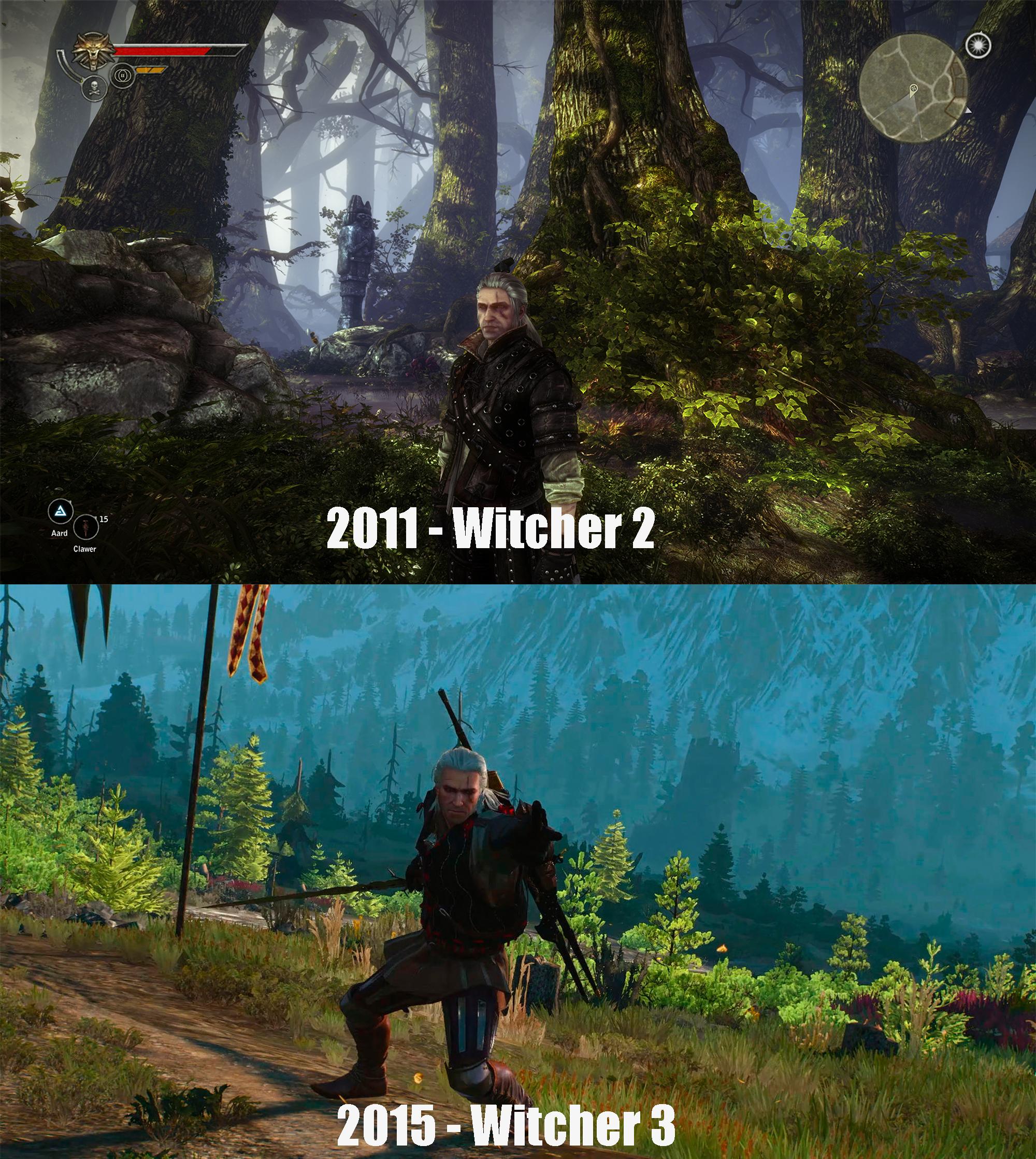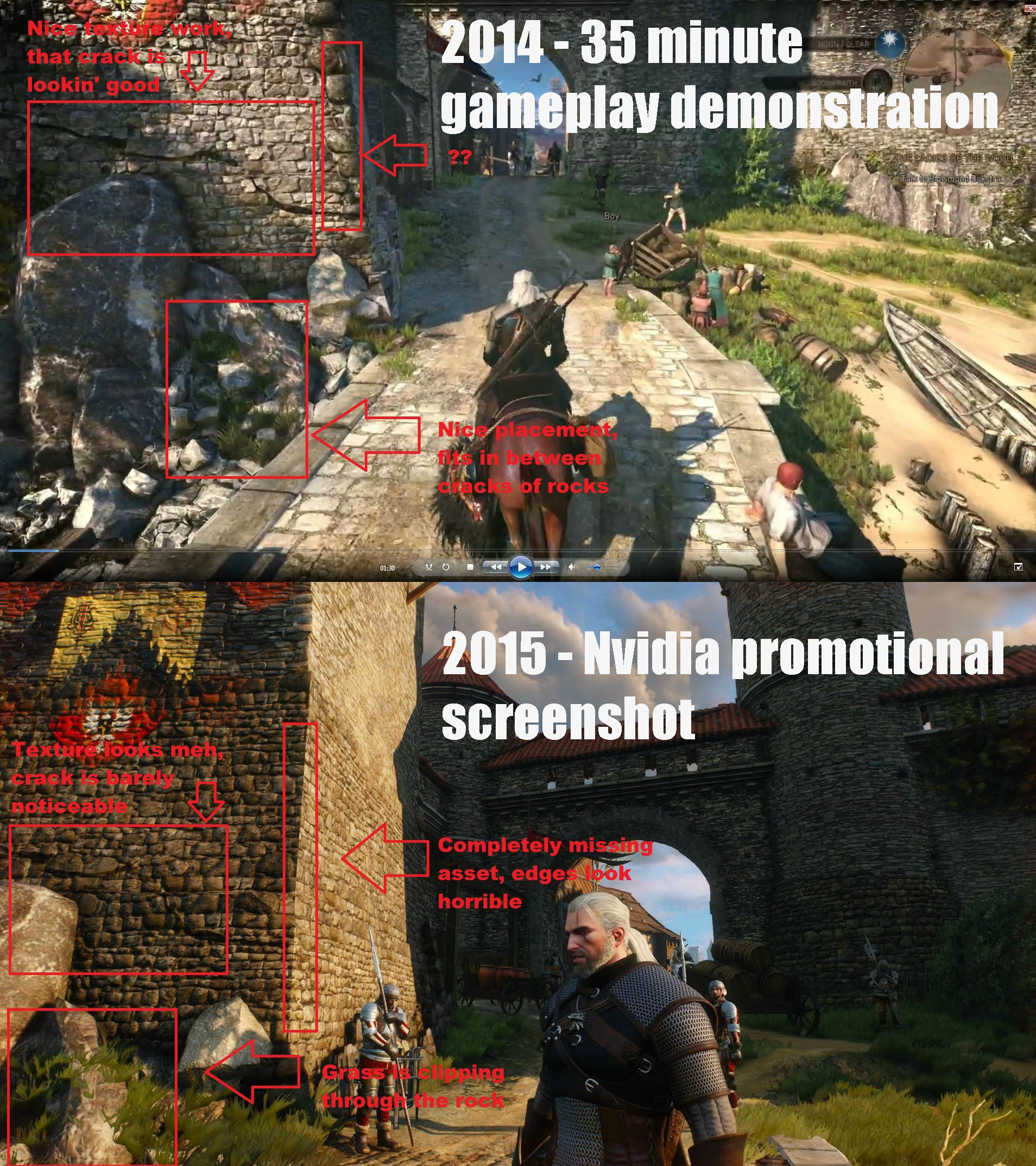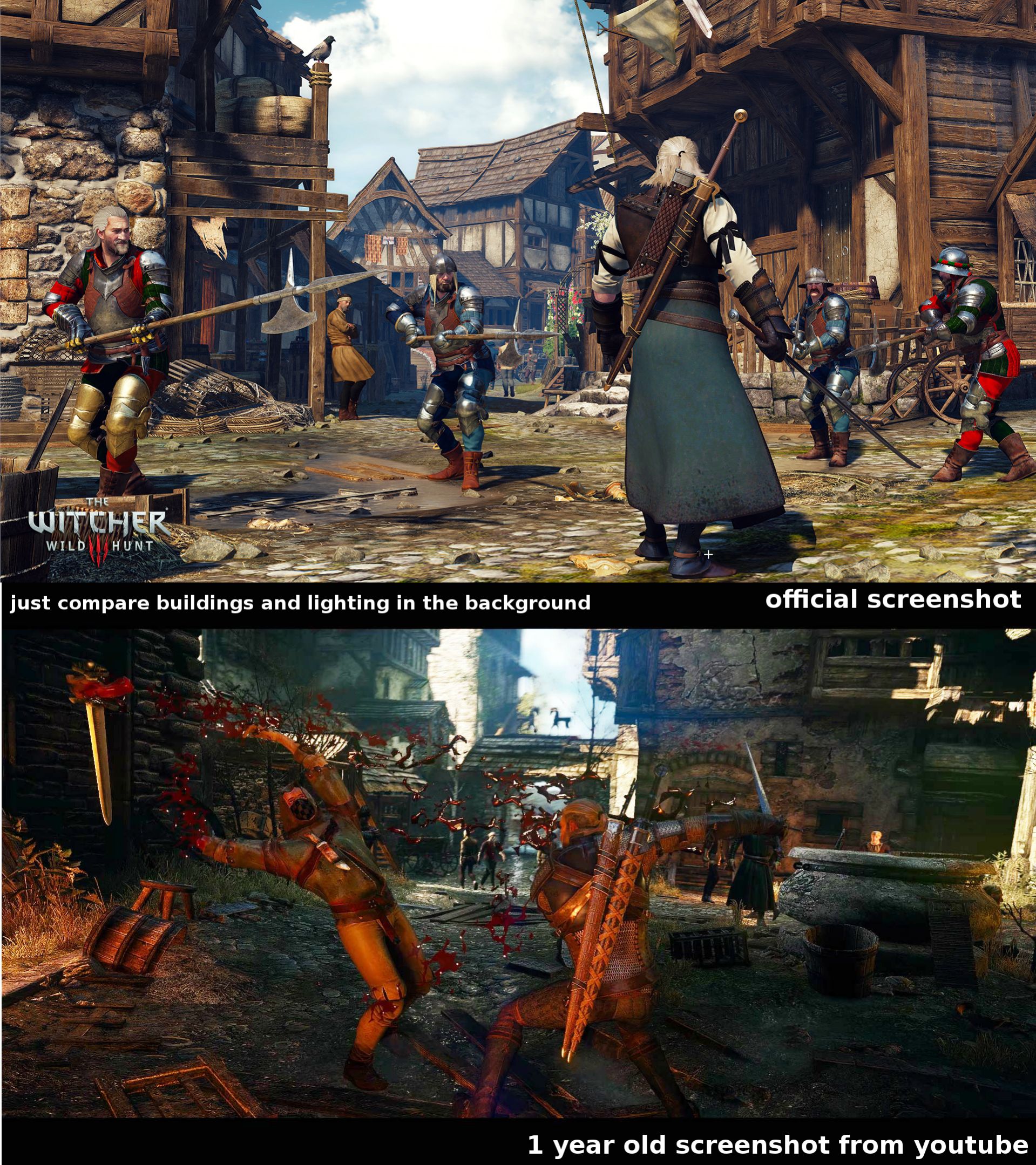 Похоже, что с момента анонса игры в 2013 году и ее дебютного трейлера, The Witcher 3 лишь теряла в графике. Это удалось обнаружить обитателю форума Guru3D под ником (.)(.), занимающегося обзорами игр на пк 2015, который сравнил скриншоты, и отрывки из прошлых трейлеров с тем, что показывает CD Project сейчас. И разница просто колоссальна.