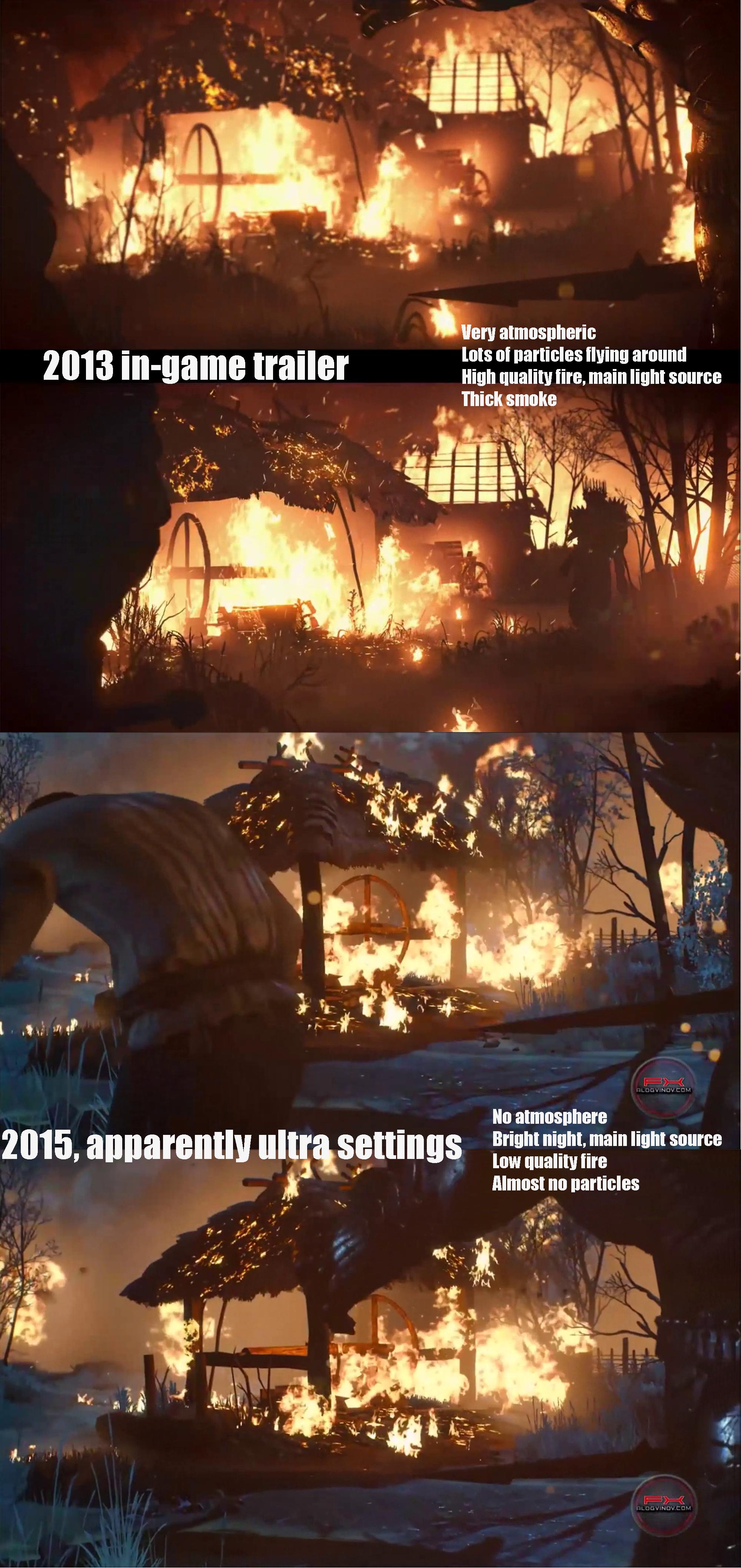 Количество частичек, отображаемых на экране, нещадно уменьшилось, система освещения потеряла свою былую красоту, текстуры стали размытыми, огонь стал низкокачественным, и это лишь часть ухудшений. Увидеть все это лично, вы сможете на скриншотах ниже, только не забывайте, что это все любительское расследование. Но судя по последним внутриигровым роликам The Witcher 3, все в действительности будет выглядеть именно так.
