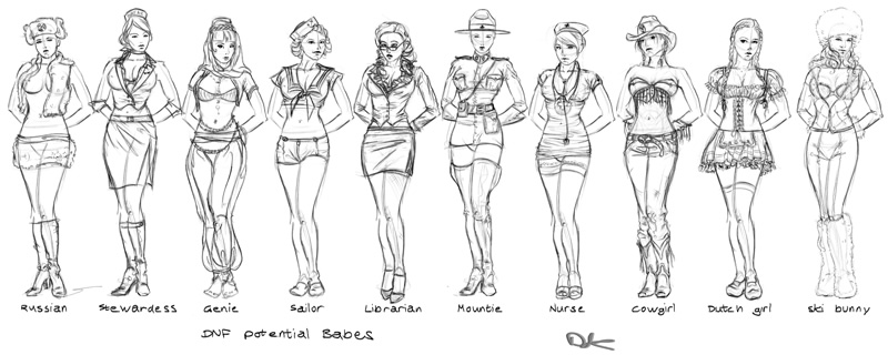 Все вы, наверное, помните, что самый лучший дамский угодник – это, естественно, дядюшка Дюк. Также многие помнят, что он очень любит похвастаться своими девушками, которые были в полном восторге от встречи с ним. Итак, благодаря этим похождениям на свет прямиком из самой печки появился концепт арт Duke Nukem Forever, на котором изображено очень много красивых девушек разных специальностей, но на первом месте среди них…