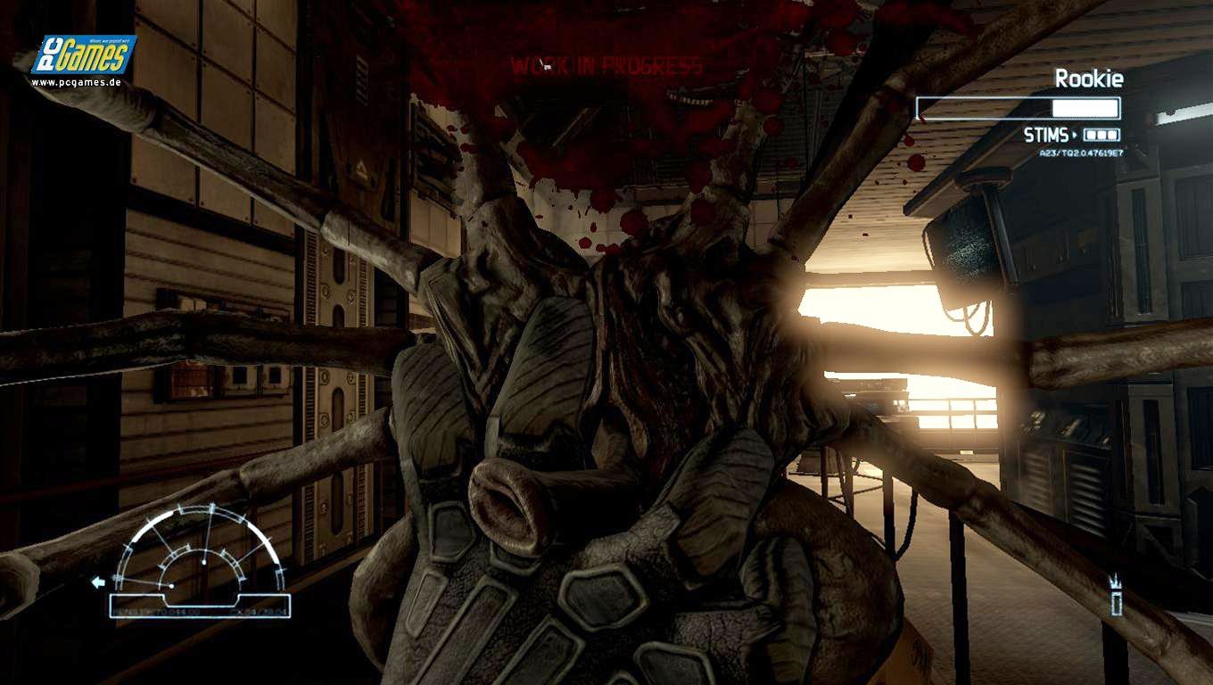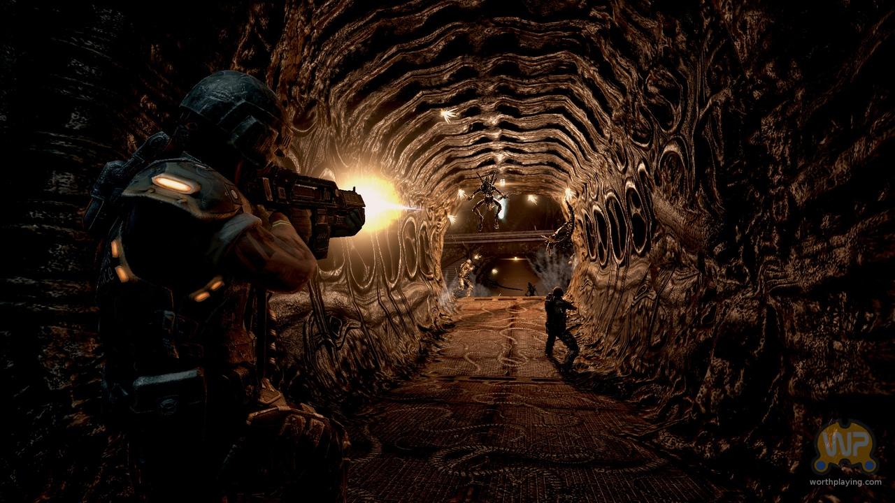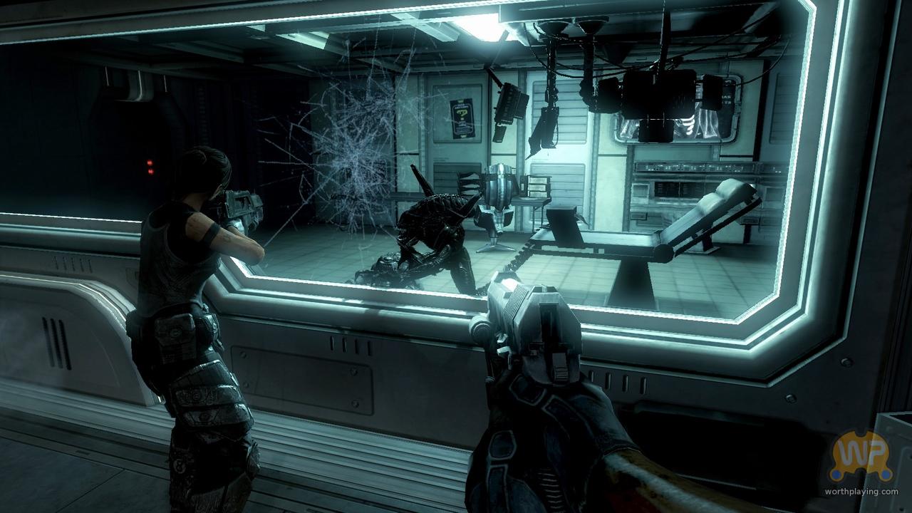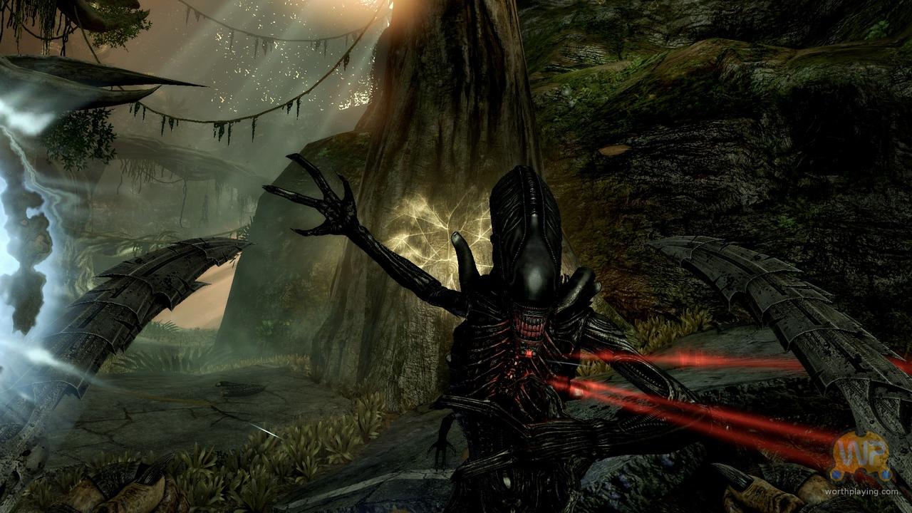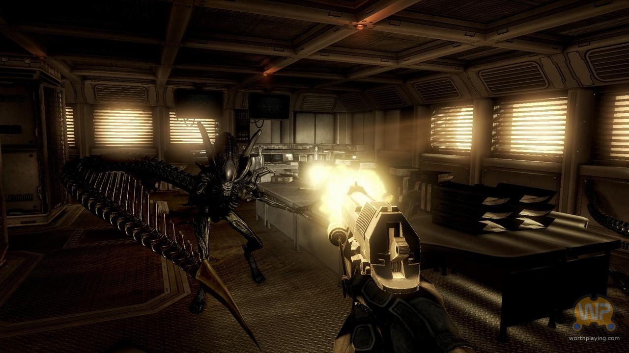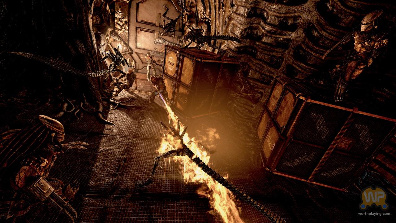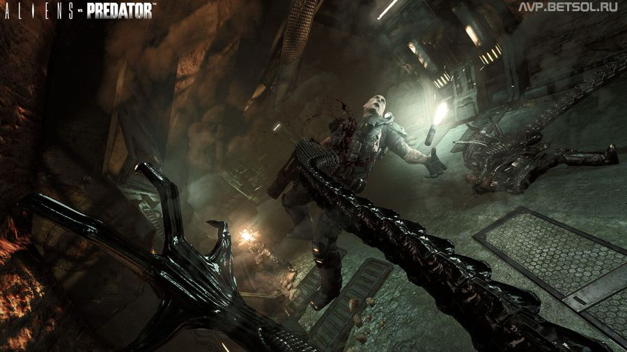 Aliens. Честно говоря, в Aliens vs. Predator 2 я так и не осилила до конца кампанию за чужого, ибо управлять им было мягко говоря было не просто. С учётом того, что ксеноморф может перемещаться по всем плоским поверхностям и носиться с бешенной скоростью по стенам и потолкам, такое адовое передвижение очень мешало ориентации в пространстве. К слову, мне удалось попробовать управление и могу сказать, что в Aliens vs. Predator (2010) скорость передвижения чужого значительно снижена, что сделано в угоду управляемости, но всё равно, к управлению надо привыкать. Также для помощи в управлении чужим было принято решение подсвечивать необходимы объекты, такие как вентиляционные люки. Еще появится что-то вроде автоноведения во время прыжка. В новой AvP, как и прежде, чужим лучше всего держаться в темноте, открытые пространства делают их уязвимыми, а вот уже в стеснённых локациях, в которых полно тёмных закоулков, чужой становится настоящей машиной для убийства, пока испуганные морпехи озираются по сторонам, ксеноморф ждёт момента чтобы вонзить свои когти в немощное тело и разорвать людей пока те не успели воспользоваться оружием.