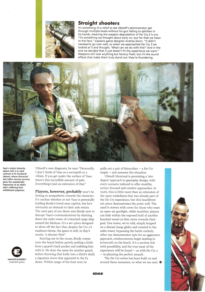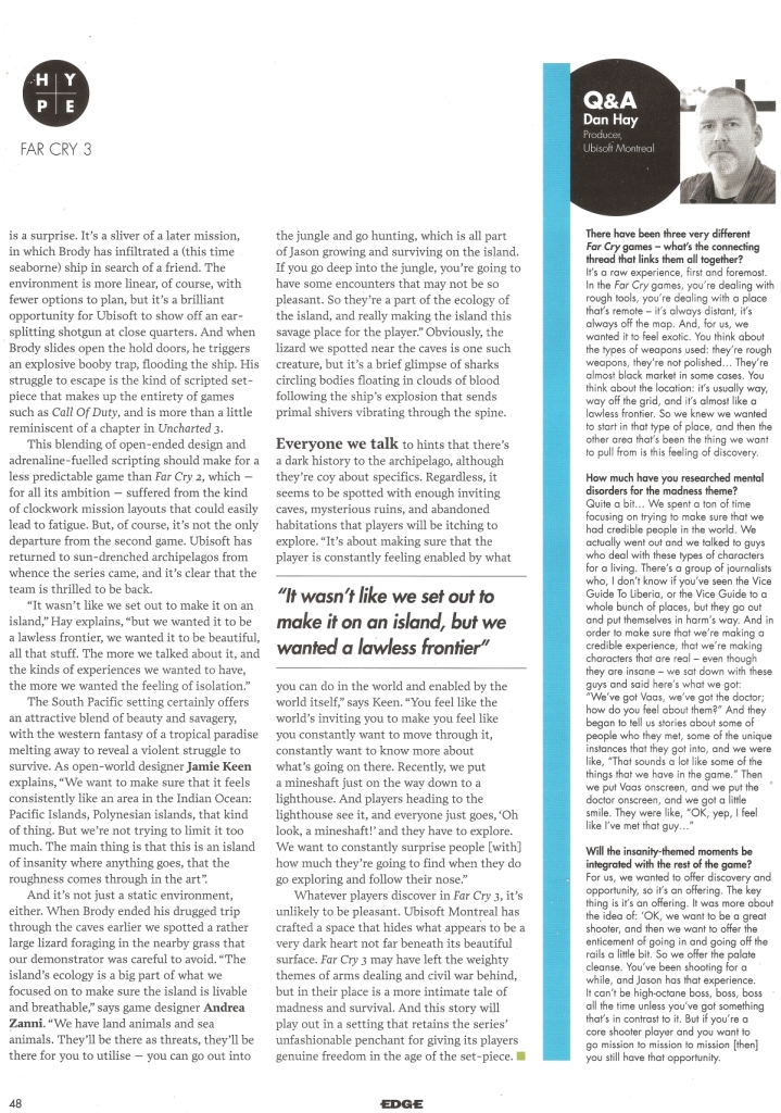 – “Это кусочек разработан для того, чтобы показать всем, что, не смотря на откровенное безумство, являющееся главной темой в Far Cry 3, игра до сих пор, по словам Хэя, остается до глубины костей полноценным шутером от первого лица“;