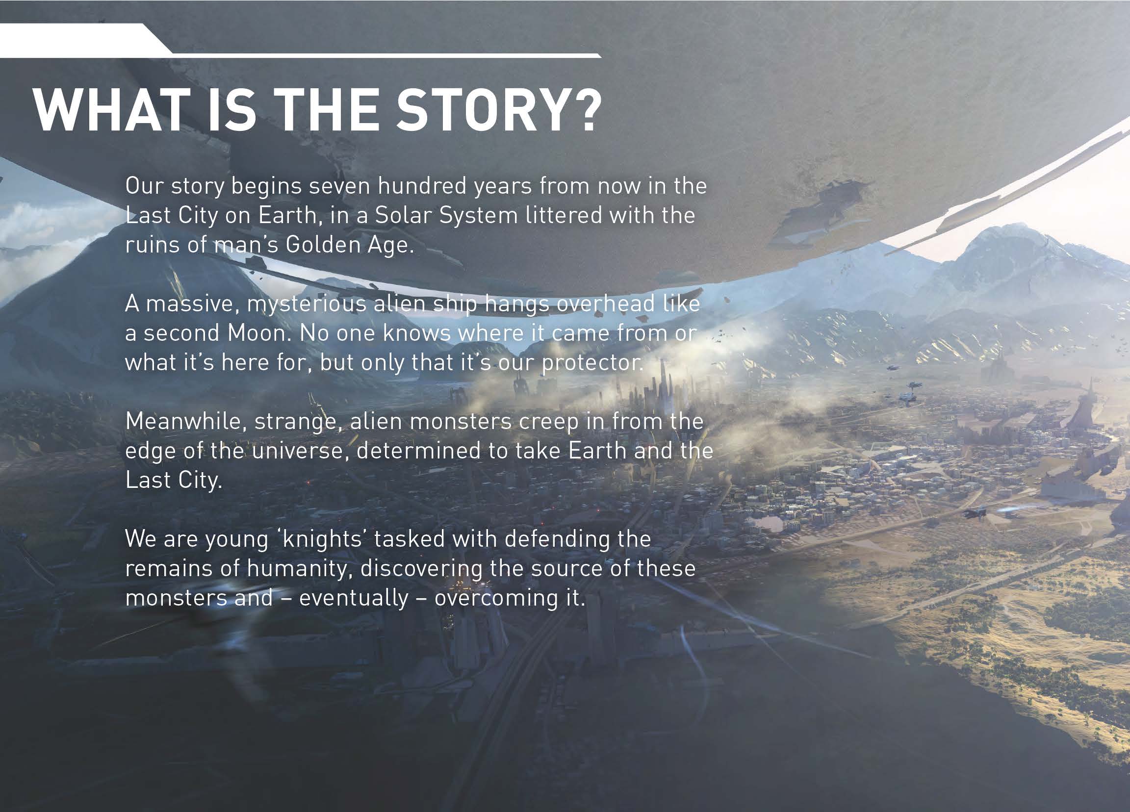 В сюжете игры лежит история Последнего Города на планете Земля, который, вместе с Солнечной Системой, был замусорен руинами Золотого Века человечества. Над городом, будто вторая Луна, нависает огромный корабль инопланетной цивилизации. Откуда он взялся и для чего, никто не знает, но единственное, в чем уверены жители Последнего Города, так это в безопасности, идущей от корабля пришельцев.