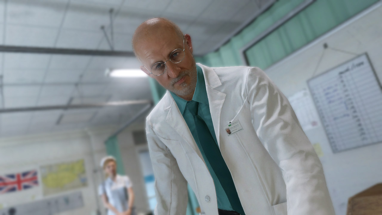 Да и еще, судя по британскому флагу на стене клиники действие происходит в Великобритании, и доктор такой странный??!! А ведь Райдена и Грей Фокса как раз сделали киборгами в Англии и возможно именно этот доктор!!! И отрезанная конечность с протезом в тему))) Как раз в стиле Кодзимы! Все связанно)))